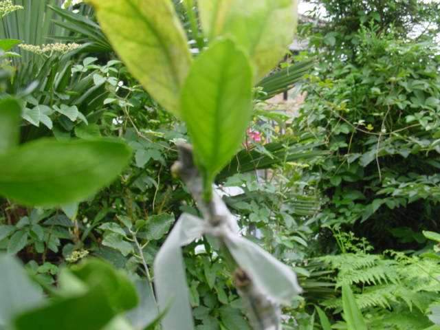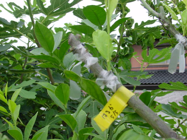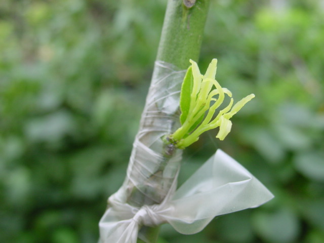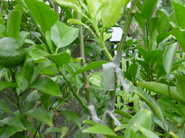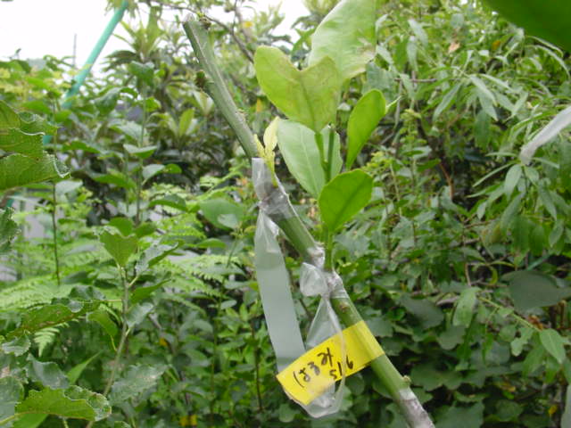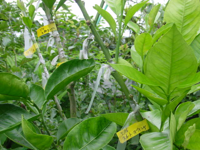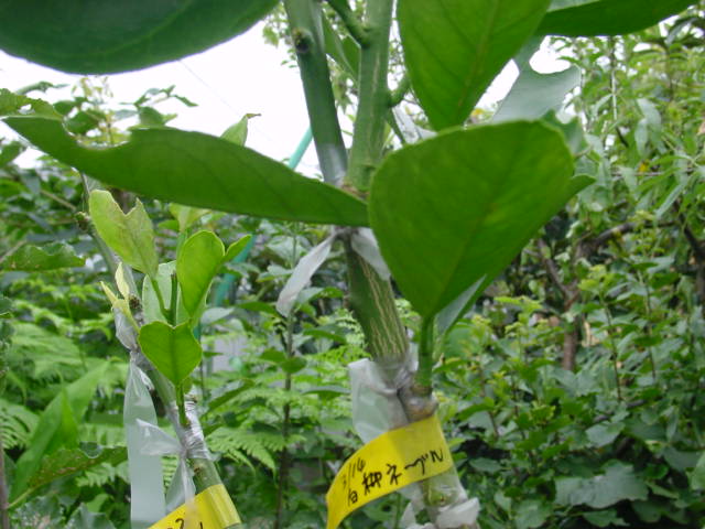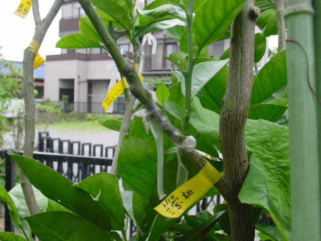 観察記録− 2009年7月12日 柑橘類の新顔 今年も穂木を頂いたり苗を購入したりして幾つかの新顔が仲間に加わりました。色々な時期に接木した穂木の芽が一応出揃いましたので、新しいメンバーの様子を披露することにしました。メイン台木の方は、少し勢力が出て接木も出来る様になって着ましたが、今年はメイン台木への接木は行わず、主に若木のハッサク台に接木しました。樹が若い事もありますが、ハッサク台は細枝があまりなく、新鞘は太めに育つので、台木としては有望と思います。これとは逆に、ポンカンの様に細い枝が沢山出てあまり接木の台木としては適さない品種もあり、多品種接ぎを予定するなら、台木を選んだ方が良さそうです。