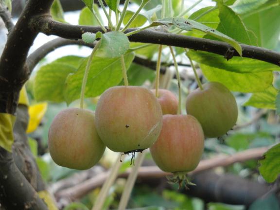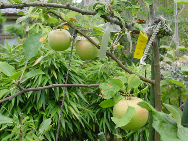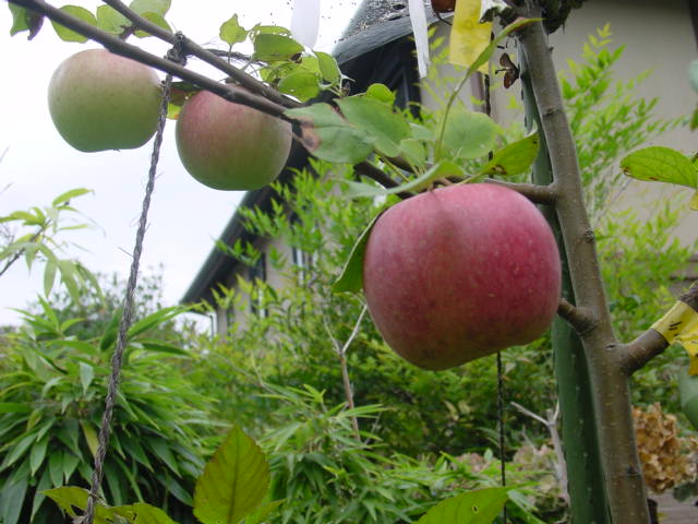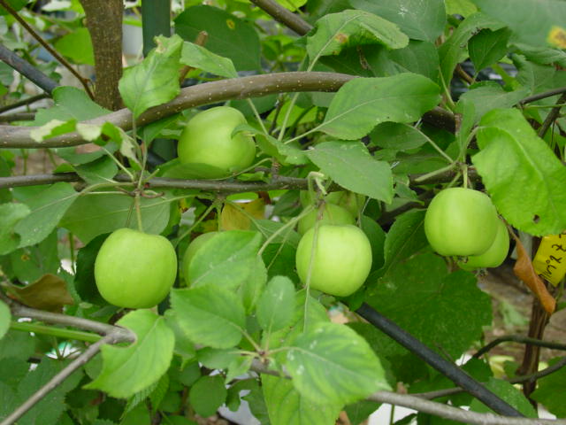 紅玉の実は大分大きくなって来ましたが、ごらんの通り緑色のままです。これはポリカの屋根の下の実のため直射日光があたらない為かも知れません。 |