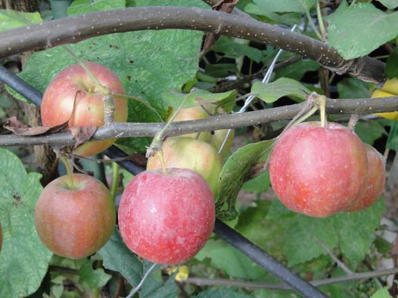 リンゴの祝が赤みを帯びて着ました。2個ほど試食してみましたが、少し小型だったものの、甘酸っぱい味は正に青リンゴそのもの味で、懐かしく美味しい味でした。 |
