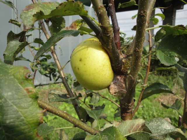今年接いだシナノゴールドに花芽があり、歪ながら実を付けました。 |