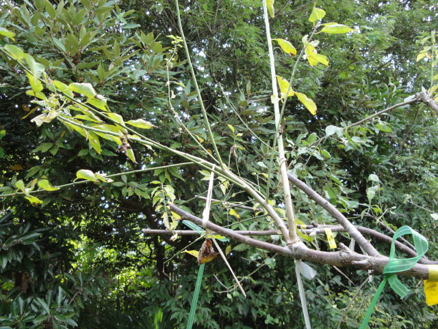 本館で勝手に生えて来た実生苗に、香緑、ヘイワード、紅妃、ゴールデンキング、アップルキウイ、その他雄木数種を接いで育てています。しばらくはこのまま棚無しで育て、そのうちなんかの果樹を近くに植え、それを使って棚代わりに出来ないかと思っています。 |