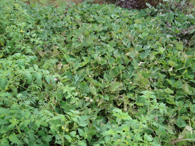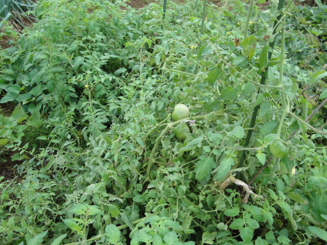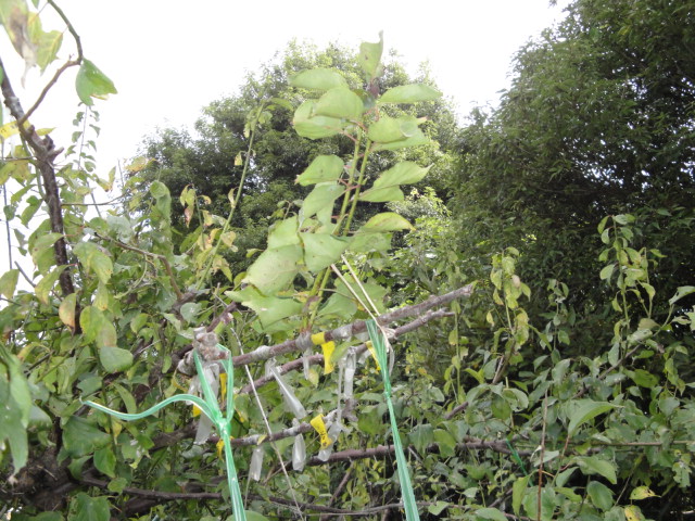鶏糞を根元に追肥して土寄せしたら急に成長を始め、いまではこのようにジャングル状態になりながら、まだ成長しています。実も沢山付いており、初夏よりも収穫量は多くなっています。 |