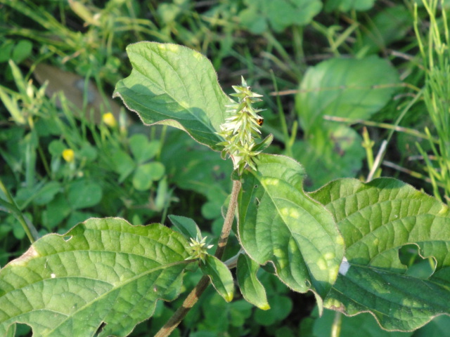 当初の菜園の主力雑草の一つです。生命力が強く、油断していると菜園のあちこちに生えてきて、抜いたと思っても根元から又すぐ芽がでて成長します。種が手袋やズボンなどに引っかかって取れなくなるのがわずらわしいので、見つけ次第引き抜いていますが、なかなか駆除出来ません。 |