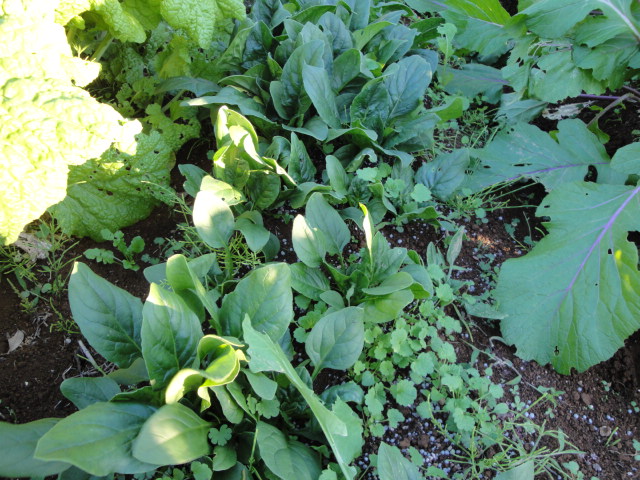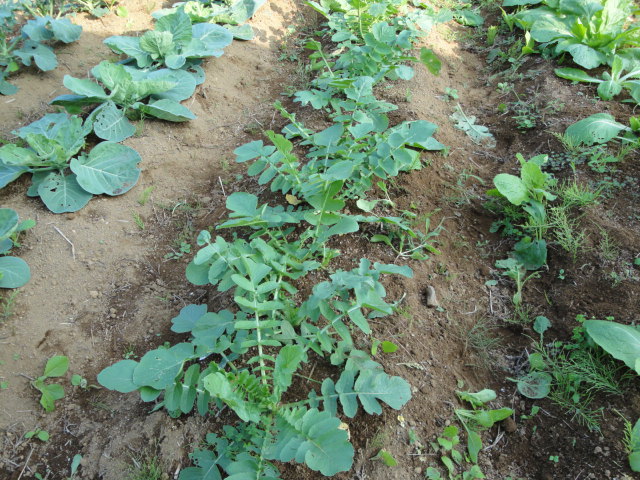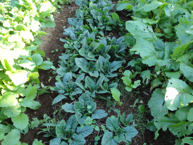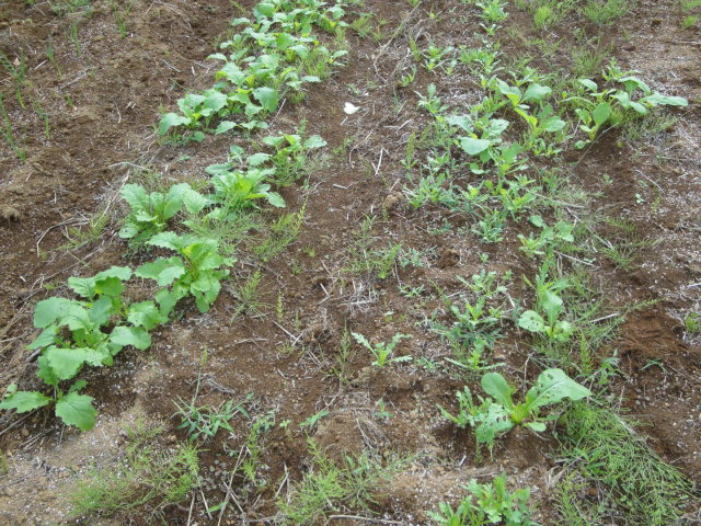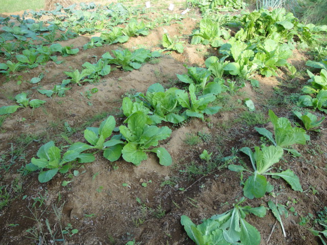 白菜の種を蒔いたはずなのですが、春に育った小松菜等の種がこぼれ、どれが白菜やら判らない状態になっていました。 |