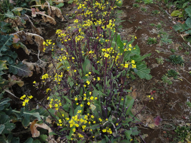 果物エリアの雑草の間に沢山生えて来た小松菜(多少雑種化している)の花が咲き始めました。私は葉だけのものはあまり好きではなく、これ位の花芽の芯の部分が好きです。 |
