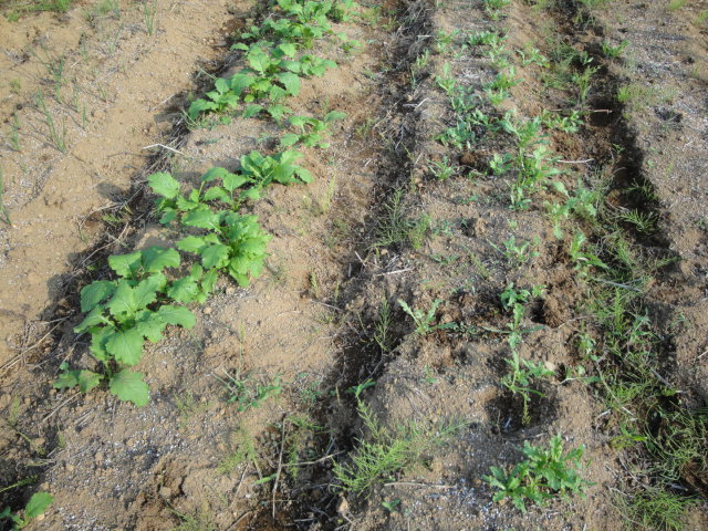 最初に蒔いた列(右の列)はだいぶ大きくなってきました。ただ、1箇所に一個しか蒔かなかったので、発芽不良又は虫の被害により歯抜けもあります。 |