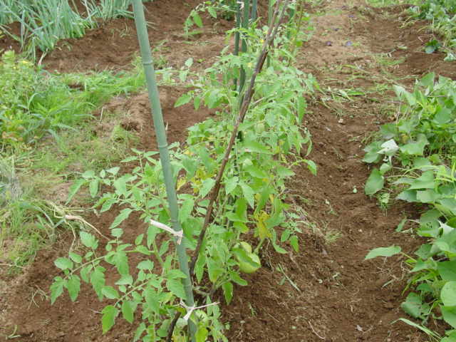 トマトはあまり肥料が多くないほうが良いのですが、それにしても少なすぎた様で、成長が貧弱すぎます。 |