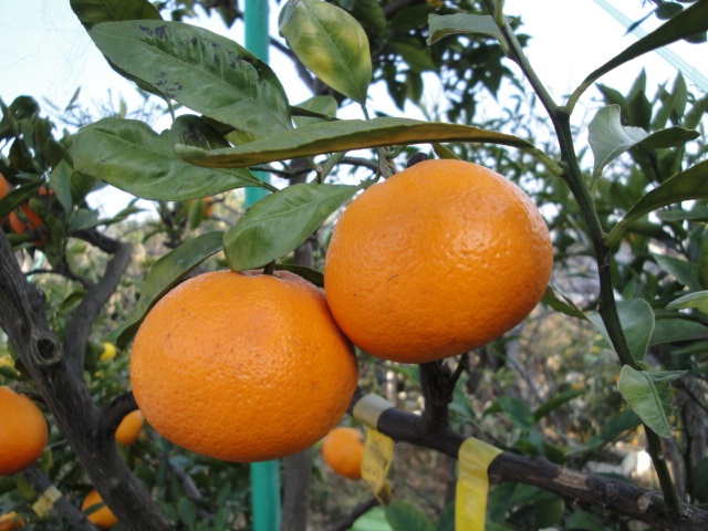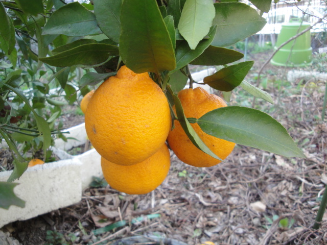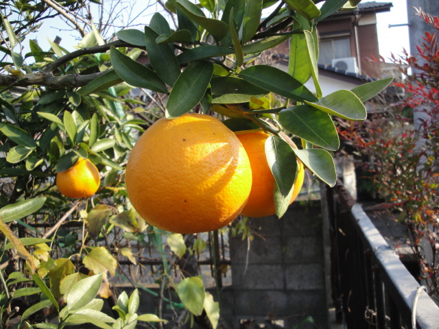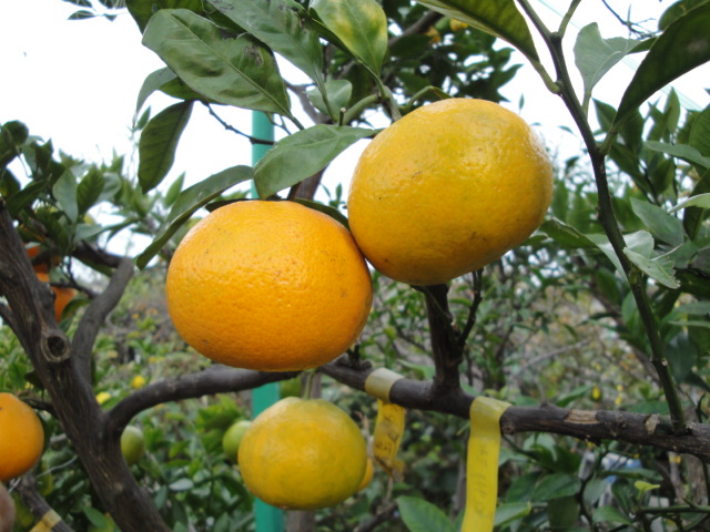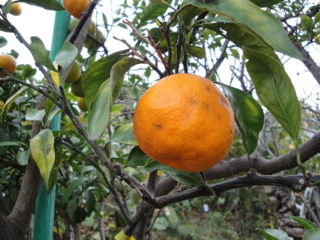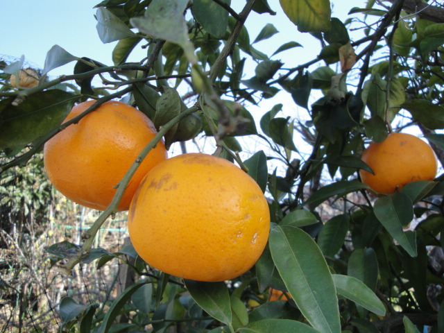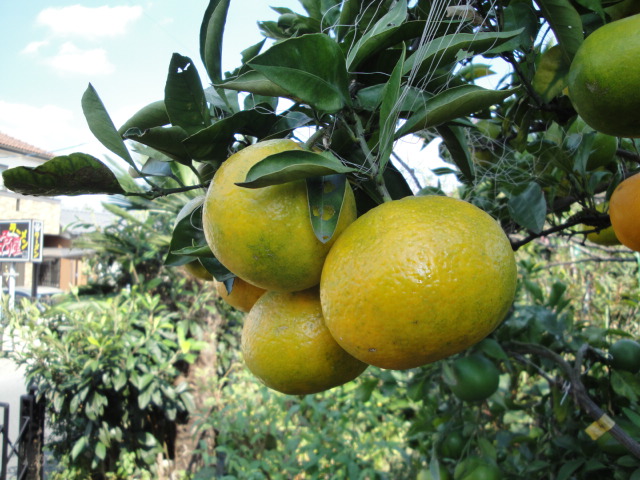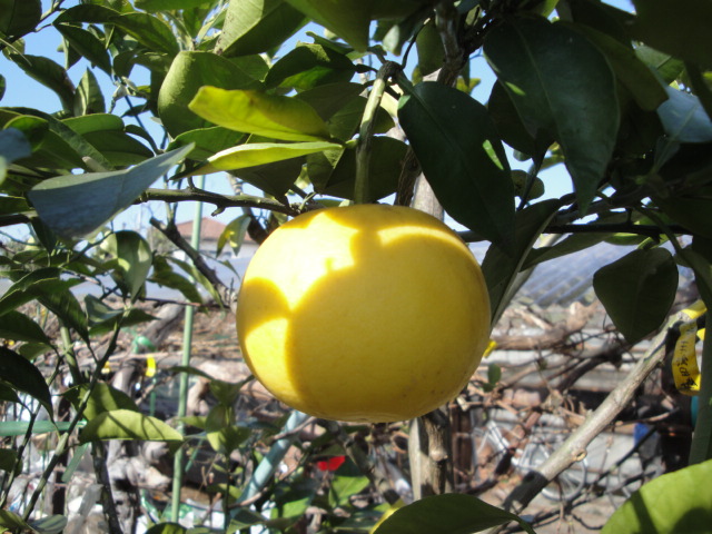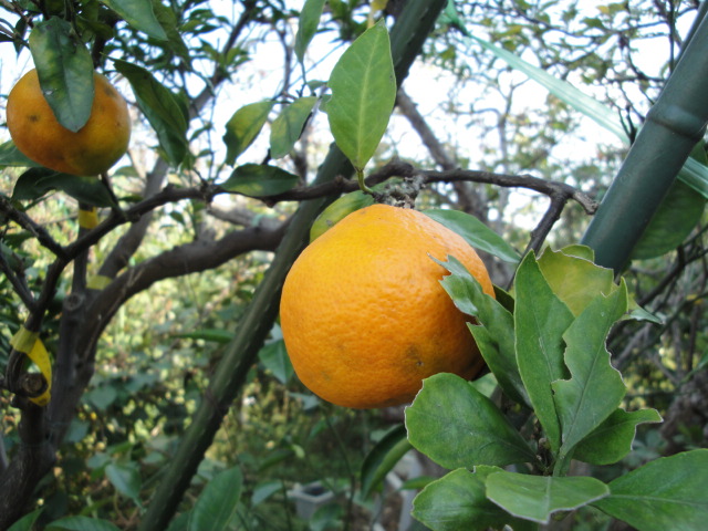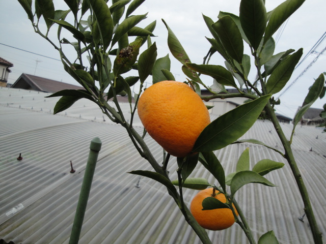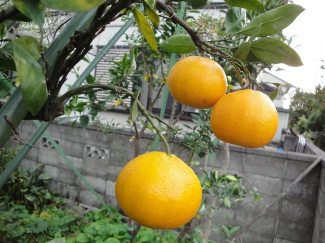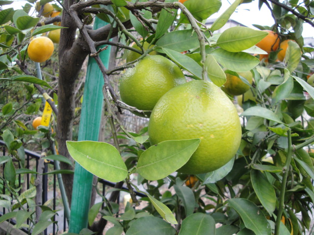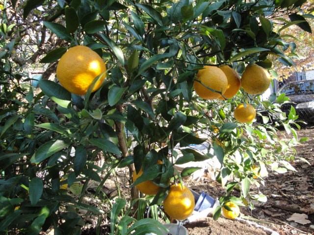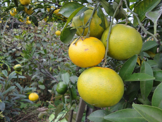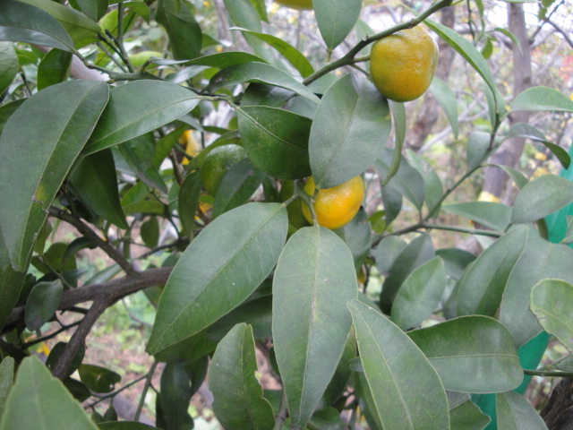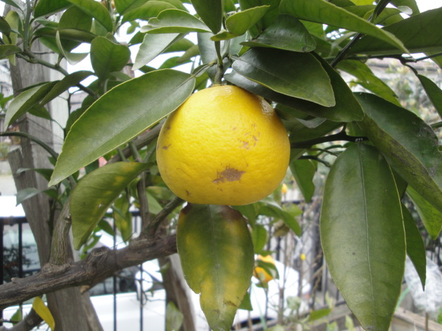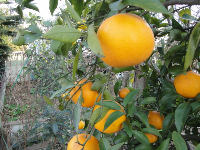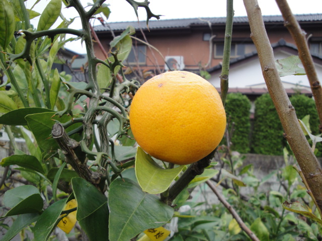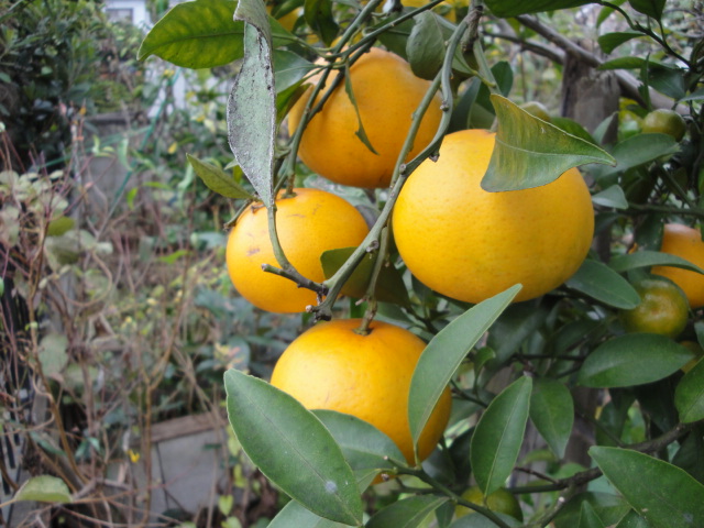 着色が少し遅れていた若木の方も黄色くなってきました。食べてみたらまだ酸っぱくて、焼酎のネーブル割りにしたら美味しかったです。 |