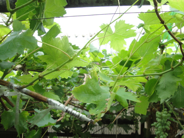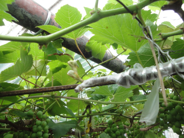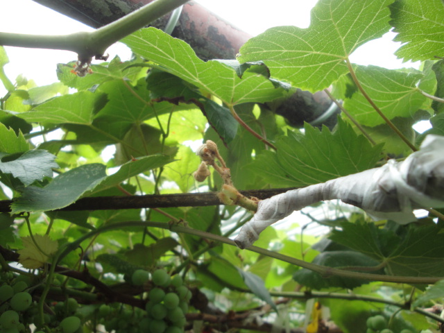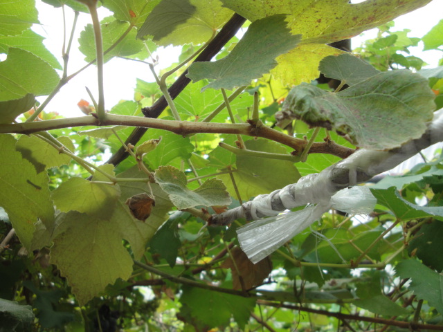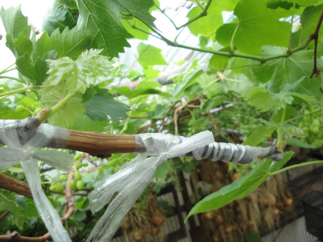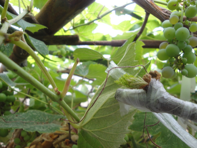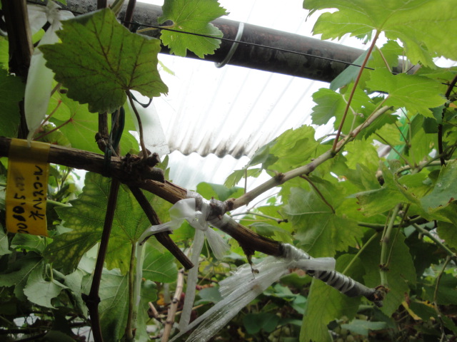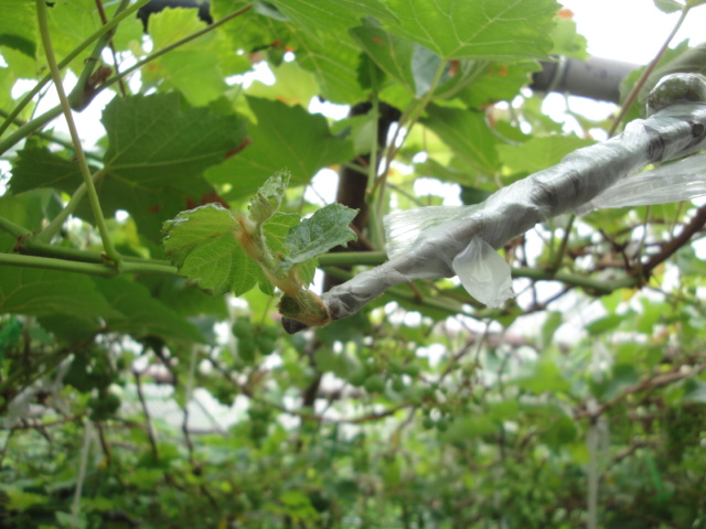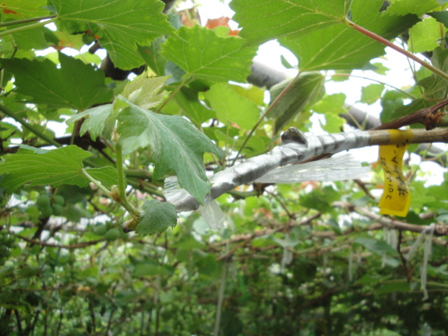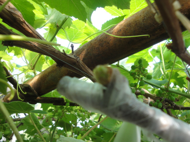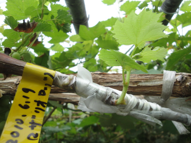 6月5日、若木に接いだベリーAです。思ったように枝が伸びませんが、ベリーAの登熟は悪くなさそうなので、何とか成功してくれそうな気がしています。 |