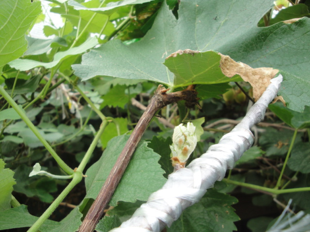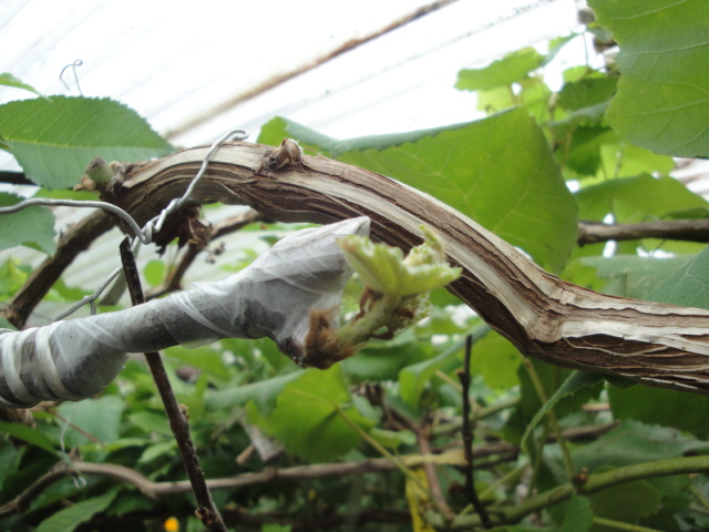 5月22日、メイン台木に休眠枝接ぎを行ったものです。今年から開始したH式(仮称)で接いだものです。初めての手法なので結果はどうなるか判りませんが、感触は悪くない様に思います。 |