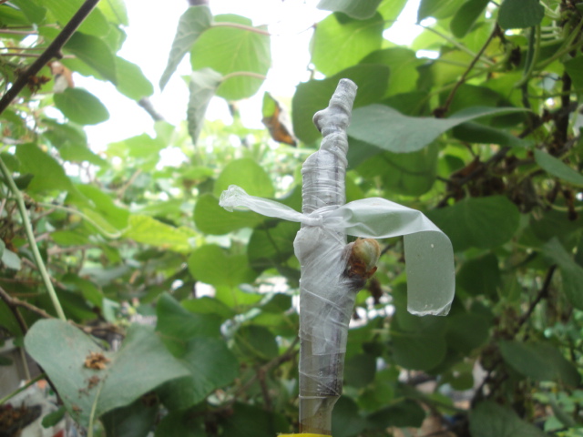 5月22日、メイン台木に休眠枝接ぎを行ったものです。枝の伸びが悪く成功するかどうかは微妙です。 |