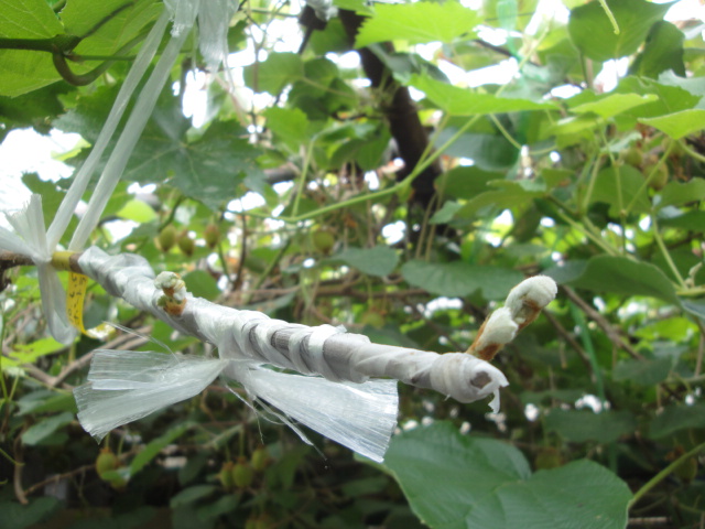 メイン台木へ接木した穂木芽が動かないので、6月5日、若木にも接木を行いました。ブラックビートの接ぎ穂は登熟が不十分だったかも知れません。接木する前に枝が半分ほど枯れていました。この接木も失敗の可能性が高そうです。
