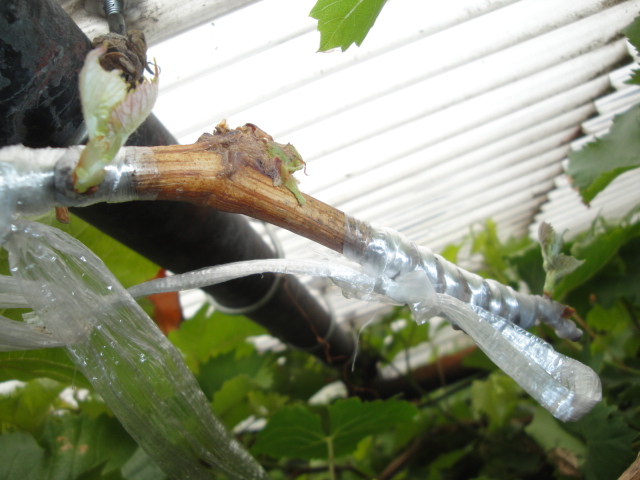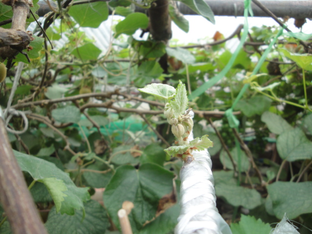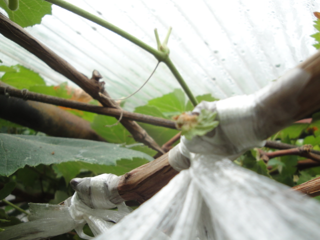 5月22日、メイン台木に休眠枝接ぎを行ったものです。今年から開始したH式(仮称)で接いだものです。あまり勢いは良くないですが、とりあえず展葉は開始しました。---> この後芽が成長せず失敗でした。 |