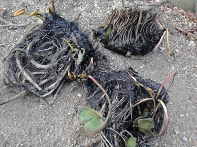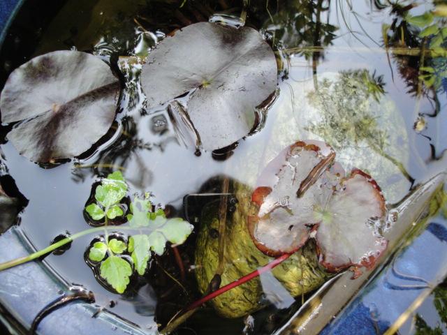 松山市のHさんからスイレンの苗を頂きました。早速鉢に植えて池に沈めておきました。メダカの隠れ場所になりそうです。 |