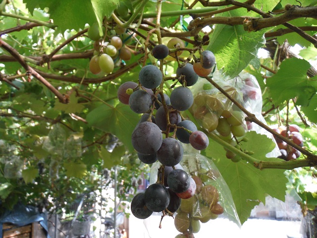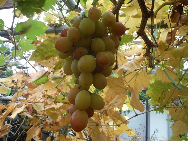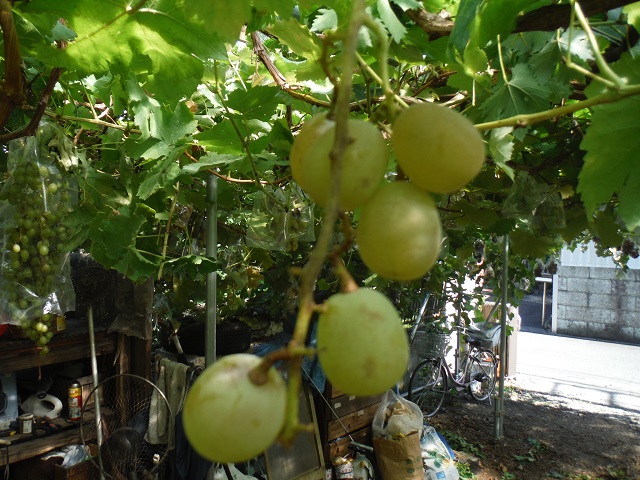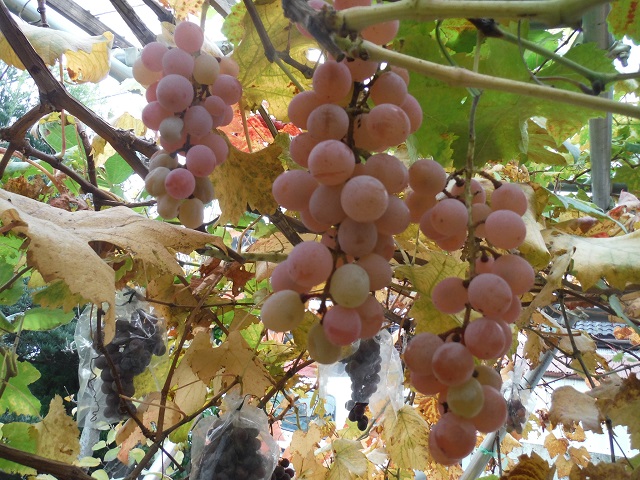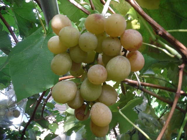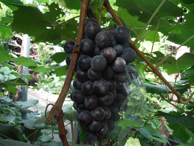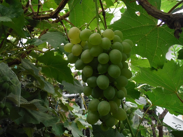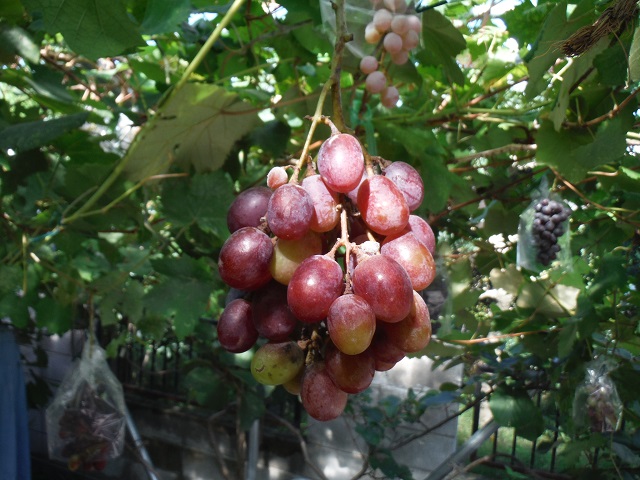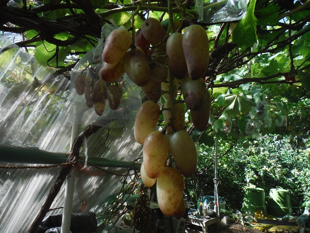 もう少し早生系なのですが、日照などにより少し遅めの熟成になりました。種無しにするともっと大きな実になる様ですが、種無しにしないで育てました。 |