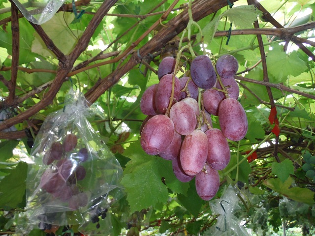 食べ頃となったヒムロットシードレスです。種が無いので食べやすいですが、収穫が遅れると粒が房からおちやすい傾向があります。 |