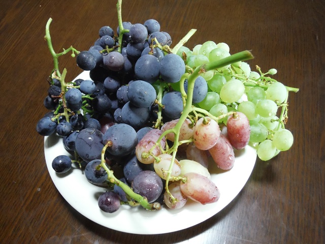 バッファロー、岩倉黒、ヒムロットシードレス、下村早生巨峰、リザマートの盛合せです。美味しいので対食べすぎてしまい、お腹の膨らみが増しそうです。 |