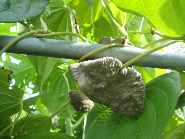 宇宙イモはエアポテト等とも呼ばれているようで、長芋の一種の様です。ナガイモは地下に芋が出来ツルに小さなムカゴが出来るのですが、宇宙芋の場合地下のイモはあまり大きくならず、ムカゴが極端に大きくなります。適度な肥料を与えると、ツルはとても強勢で、5m位は楽に伸びて行くようです。