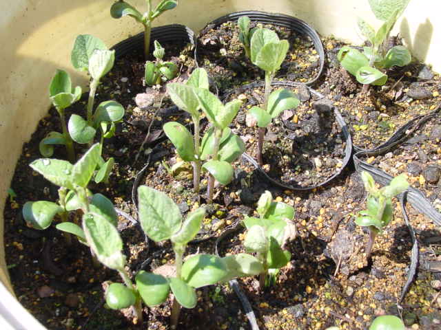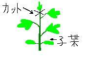 枝豆について 大好きなビールのツマミとして、枝豆は我が家の菜園の主役となっています。 窒素肥料の供給元としても有効な野菜ですので、多いときは菜園の7割方が枝豆で占められ枝豆畑の様相を呈する時期があります。 植付時期 4月になり暖かくなったらポットに種を植付苗作りを始めます。本当は4月末位に植えつけるのが一番良いようですが、そんなことはかまっていられません。 とにかく4月から7月末位まで毎週の様に枝豆の苗作りを行っています。 種を植えて苗になったら畑に植え付け、植え付けたら又すぐ種を播くという具合です。 現在8月の種まきに挑戦しているところです。 枝豆は種類により、超早生、早生、中生、晩生と種類がわかれており植える時期の注意が必要です。特に晩生は早すぎると葉ばっかり繁って実少ない様ですし、遅すぎると実が成る前に冬が来てしまいます。 晩生は7月初旬から中旬位に播く様にしていますが、その他はあまり気にしなくて良い様です。 いい加減なことが嫌な人は4月中旬ころ、超早生、早生、中生を一度に播き、7月初めに晩生を播くと良いのではないかと思います。そうすると次々に食べることができます。 私の場合他の野菜が大きくなる前にその脇へ、そろそろ終了する野菜の脇へ等カエルさんやミミズさんの日陰も兼ねて時期はかまわずどんどん植えていきます。 日々の手入れ 植えつけ2〜3週間後に本葉が3枚出たところでそれ以上伸ばさないで側枝を出すよう、頂上の芯をカットします。(一番下の子葉を含まないで3枚の葉を残す事に注意) 以前友達に枝豆の栽培を勧めカットするのを見ていたら、3枚目の葉のほうを一生懸命摘んでいたことがあります。大切な葉のほうは残してやる必要があります。 その他特に手入れは必要ありませんが、4月植え以外は苗が徒長し倒れやすくなります。倒れたら、小枝を支柱代わりにでもして起こしてあげると良いと思います。 あとは触ってみて豆が膨れていたら楽しい収穫です。 以下の図は枝豆の頂芽をカットする例です。 くれぐれも葉のほうをカットしないように!! ![]()
