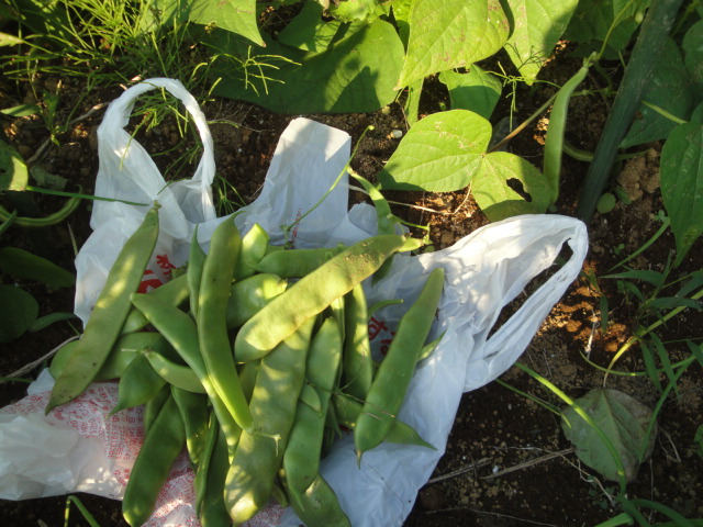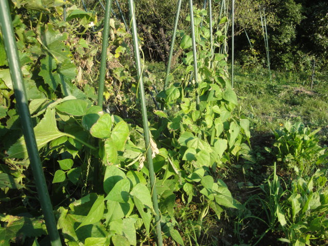 インゲンについて 夏に葉っぱものの野菜が取れにくくなる時期に収穫出来便利な野菜です。寒には弱く枯れてしまい、暑すぎても収穫が少なく、又固くて食べられない鞘なりますので、初夏や秋の収穫がメインになります。比較的涼しい温暖な時期に良く育ち収穫も多くなります。 植付時期 4月末頃苗を植えつけるのが一番上手く出来るようですが、私の菜園では4月初め頃まず手無し種をまきます。これは割と早めに一斉に実を付けて収穫が終わってしまいます。 次に4月の中ごろ手有り種をまきます。これには支柱が必要です。6月ころから実を付けはじめ8月まで収穫出来ます。 又様子を見て7月頃にも手有りの苗を作っておき、キュウリの後に植えています。 早く播いたり遅く播くインゲンは割と難しく収穫は多くありません。今後種類や時期はもう少し色々試してみて上手く作れるようにしたいと思っています。 日々の手入れ 植えつけてしまえばツルが支柱に絡まって勝手に伸びてくれるため特に手入れは不要です。 害虫で一番被害の大きいのは芯食い虫です。 これにやられると根元に近い方の茎が虫に食われ上のほうが枯れてしまいます。茎を食われているのを見たらスポイトで薬を注入することもありますが、大体はそのままあきらめ次の野菜を植えたりしています。 生育と収穫の様子