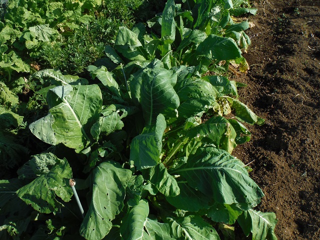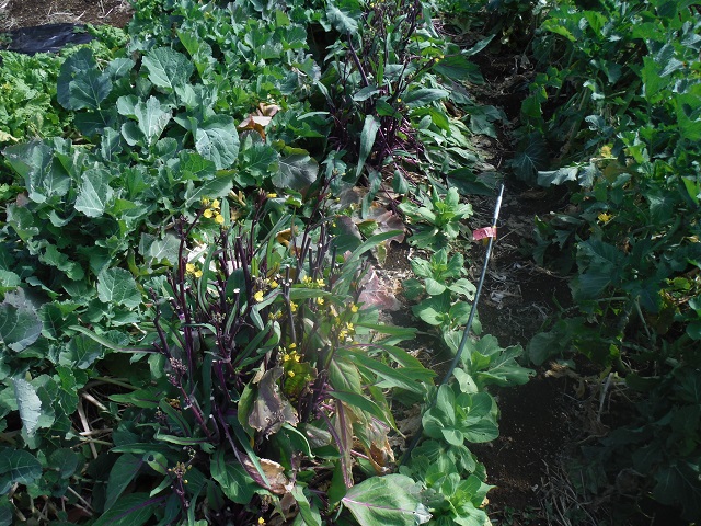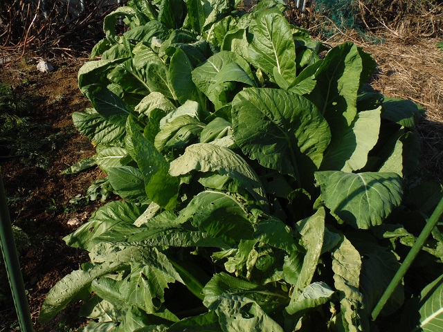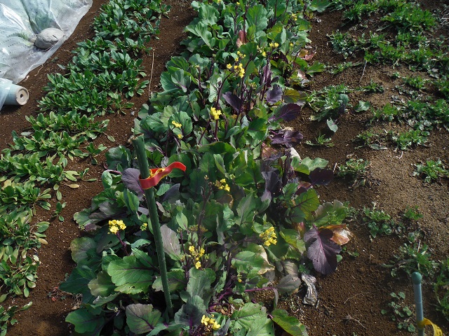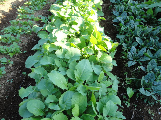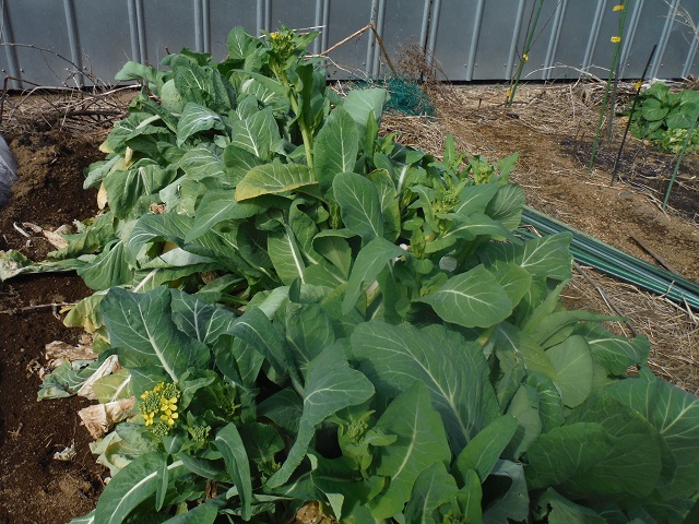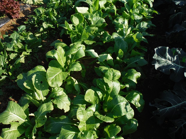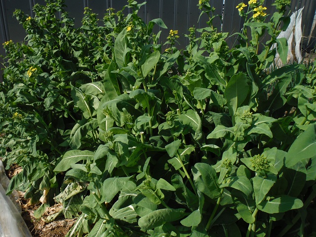 小松菜等について 小松菜、菜花、山東菜、油菜等は少しづつ性質は異なり食味も異なりますが、同じような性質を持っており、植付け時期も似ています。 上記作付け計画表では小松菜と菜花しか記載していませんが、同じ畝に山東菜と小松菜を植えたり、別な組み合わせで植えたりし、色々な野菜を楽しむようにしています。 小松菜 葉もの野菜の中ではホウレンソウやキャベツ、白菜等と並んで最も多く利用される野菜の一つと思われます。我が家の菜園では毎年育てる様にしています。暑さ寒さが極端でないところでは年中作れるようですが、一番美味しいのは秋口に植え正月頃食べるものです。ただそれだけだとさみしいので、春先に植え初夏まで食べるようにするとなかなか便利です。ここ埼玉では9月初めに植えると結構虫がつくので、植えた後不織布という薄い伸縮性の虫除け資材で全体を覆います。そうすると青虫等が発生しません。収穫は、根こそぎ引き抜くのではなく必要な分だけ葉を摘んで利用しています。そうすると長期間食べられますし、春先に花と柔らかい茎を収穫することも出来ます。私は通常食べる葉っぱよりも蕾付きの茎の方が好きです。お浸しが最高です。