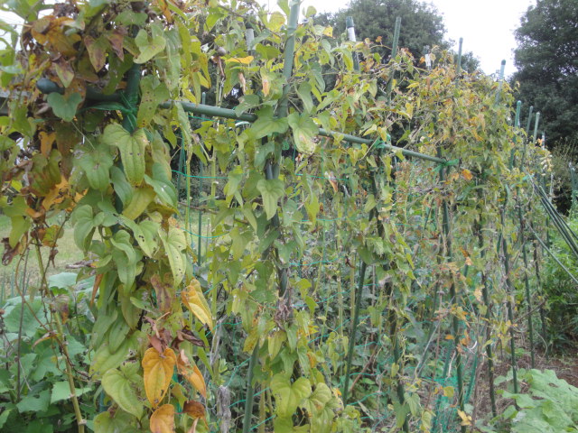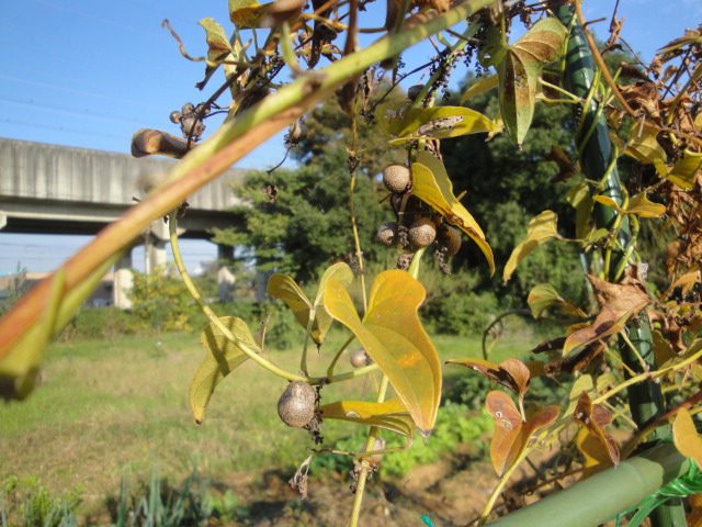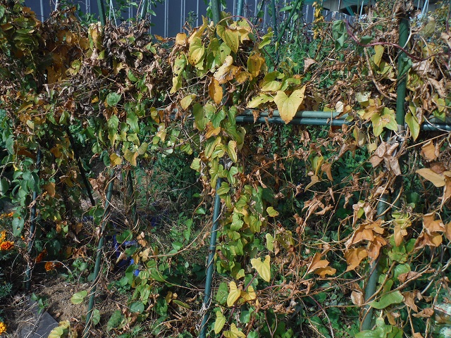 日々の手入れ 4月末頃植え付けしばらくするとツルが出て来ます。一度ツルがでるとすごい勢いで伸びてきますので、ツルが出たらすぐ支柱を立てツルを誘引します。支柱は1.8m 位以上の長いものの方が良い様です。 支柱は頑丈なものにし、葉が繁ってきても倒れない様にしましょう。 害虫は殆どつかないので、植えてしまえば特に手入れは不要ですが、時に長さ10cm位になる巨大な毛虫(最初緑色でそのうち茶色になる)がつくことがあります。大きいだけに食欲旺盛で、下手すると葉を全部食べ尽くされますので、見つけ次第退治する必要があります。