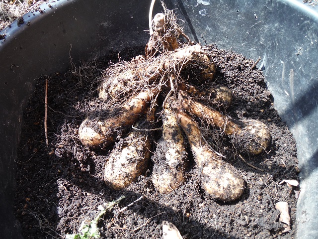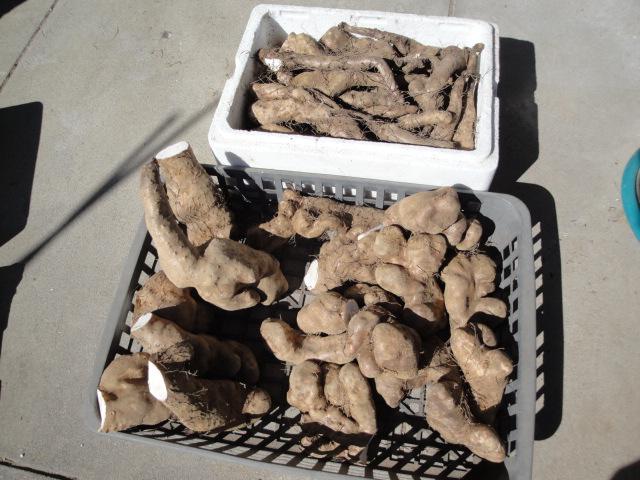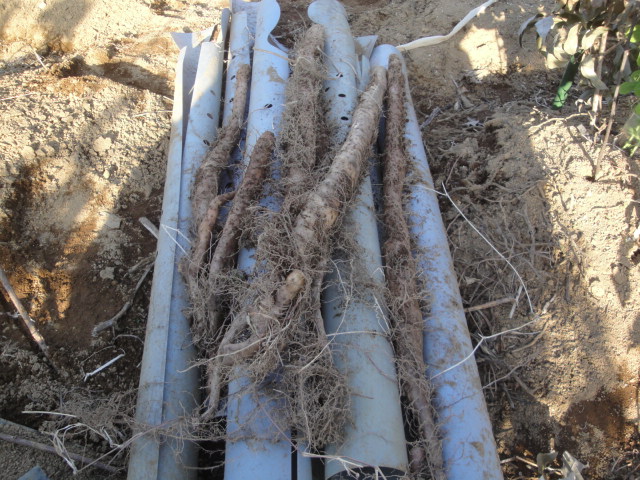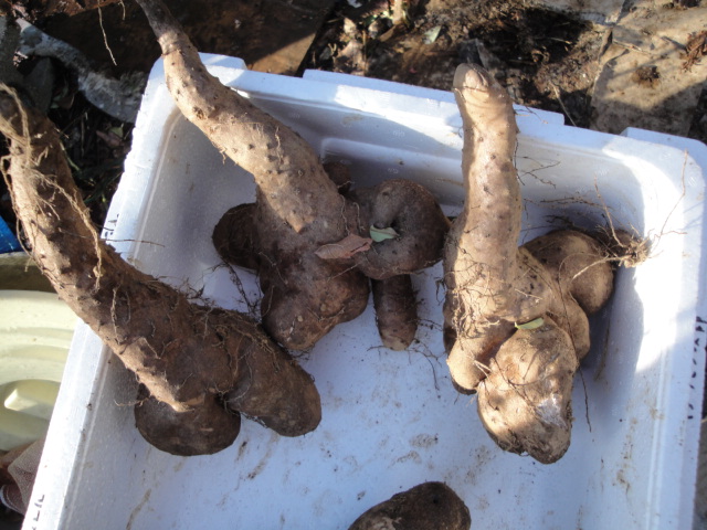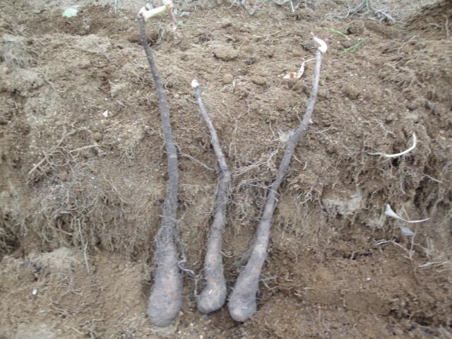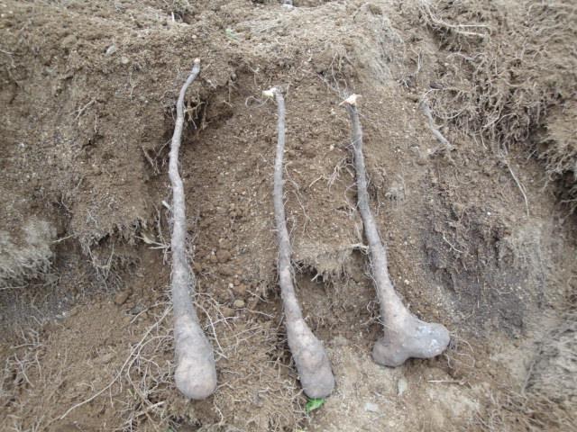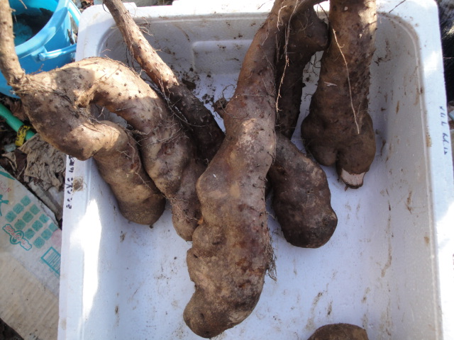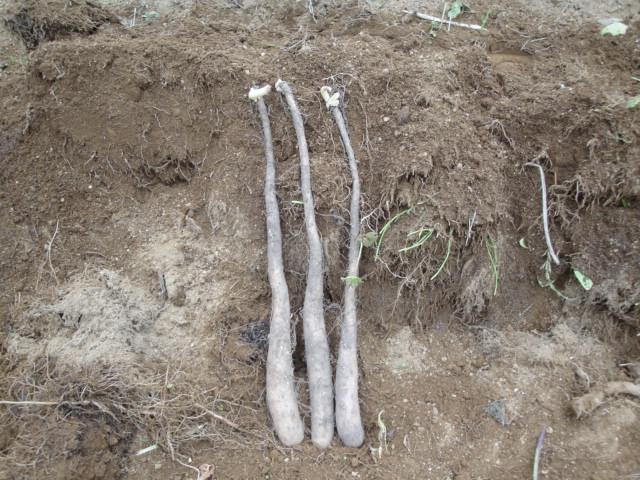 長芋について 長芋は掘るのが大変ですが、それ以外は害虫も少なく手入れも殆ど不要です。 場所は特に決めていませんが、連作すると線虫の影響で芋が黒っぽくなったり、肥大が思わしくない場合がありますので、同じ場所に続けて植えることは避けています。一畝植えておくと結構何回も食べられ重宝します。とろろそば、ご飯にかけて食べる他、千切りにして醤油をかけて食べると酒の肴としても結構いけます。 植付時期 4月末のゴールデンウィーク開始の時位に芋を植えつけます。 20cm位の芋をそのまま植えるのが最適です。 大きな芋は、ツルの出ていた上部の硬い部分を卵2個分位切り取り、それを植えつけても良いです。 種芋はホームセンター等でも売っていますが、通常の野菜やさんで売っている長芋を3cm〜5cm位に切って植えつけても育てることが出来ます。但し、この場合、植えつけた年はあまり大きな芋となりませんので、出来た芋を再度翌年植えることにより大きな芋になります。 品種 野菜やさんで売っているのを見て頂ければ判る様に結構色々な品種があります。長くなるのは掘るのが大変なので、宮菜園では主に長くならない種類のものを植えています。これだと脇を少し掘り、スコップを深くさしこんで持ち上げるだけで一発で掘り起こせます。時々途中で折れる事もありますが、別に折れても食べられるのであまり気にしないことにしています。 長くなる種類のものを植える場合、長芋専用の資材を使っています。 芋が円筒形の筒の中に出来るもので、筒を斜めに土に植えておくと筒毎簡単に芋を取り出せます。この資材は通販や大き目のホームセンタ等で購入することが出来ます。現在以下の品種を育てています。
