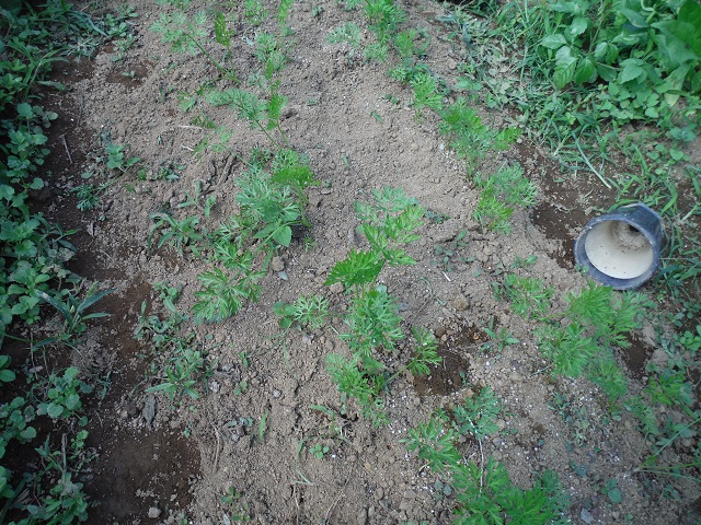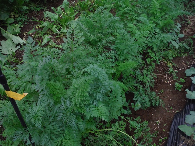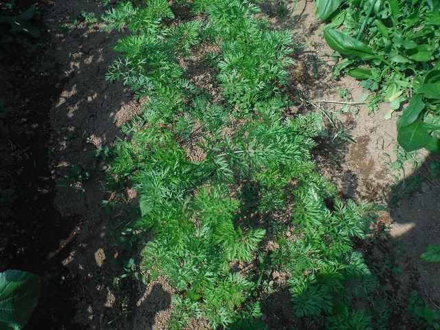 人参について 子供の頃の嫌いな野菜トップ3と言えば、概ね人参が含まれると思います。 大人になって好きになるかというとそうでも無い様で、いまだにそれほど食べたいと思いませんし、積極的に食べたいとおもう野菜ではありません。 とはいうものの、大根などに比べると健康野菜というイメージがあり、味が嫌いと言う感じもなくなりました。 ということで、普通に食べる野菜として、なるべくこまめに作るようにしています。 種蒔時期 春は3月頃、秋は9月ころ種をまくと上手く作れます。好光性の発芽特性があり、種蒔時、土を薄くかけ乾燥させないと発芽がうまくいきます。 日々の手入れ 種蒔直後の乾燥防止が重要です。 発芽ご適当に間引きすれば、順調に生育してくれます。 生育状態