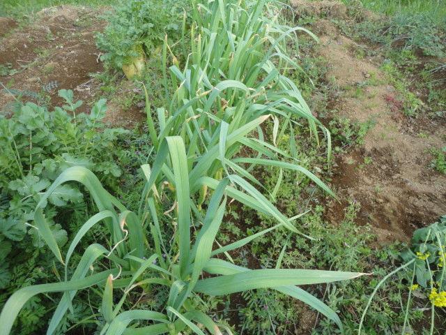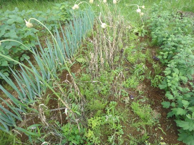 雑草に埋もれて見え難いですが、ネギ坊主の着いたニンニクの生き残りの茎のある畝がニンニクの栽培畝です。